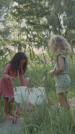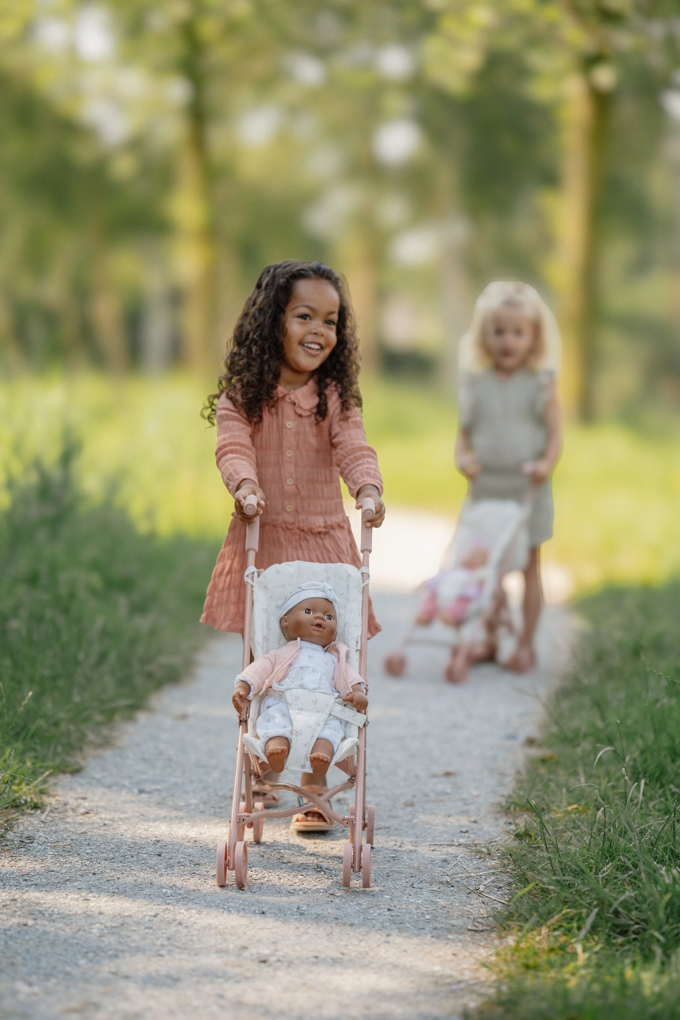 Where will your imagination take you today? Get your favorite doll or stuffed animal ready and let the doll stroller lead the way to a new adventure. The seat is adorned with the enchanting White Meadows design, and the matching bag on the handles offers storage for all important doll accessories. The strap ensures that the baby doll stays securely in place during walks. The metal doll stroller with a pink frame, pink handles, and 4 pink wheels is designed to promote imaginative play and nurture a sense of responsibility in young caregivers. The stroller can be easily folded, making storage a breeze. Watch as your child joyfully pushes the doll stroller around, sings songs, and pauses to feed or comfort the imaginary baby, learning life skills through the magic of play.