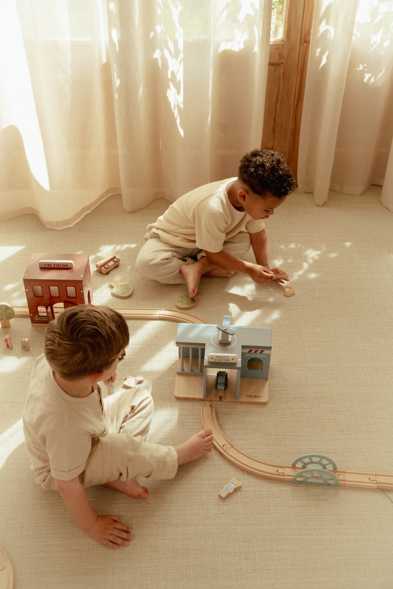 Two children playing with wooden police station and wooden fie station