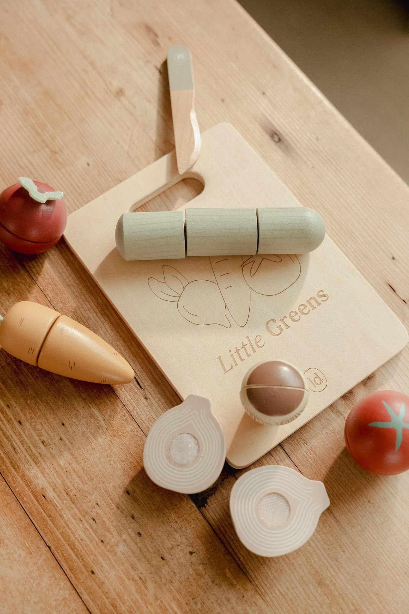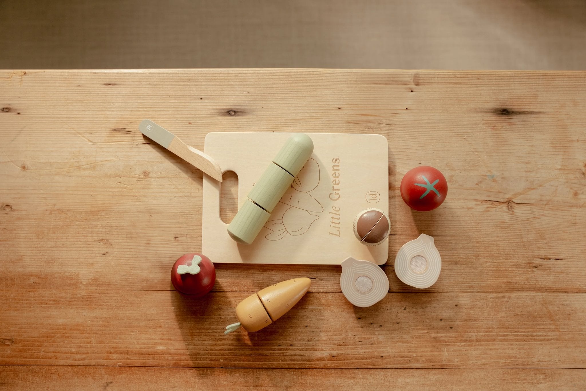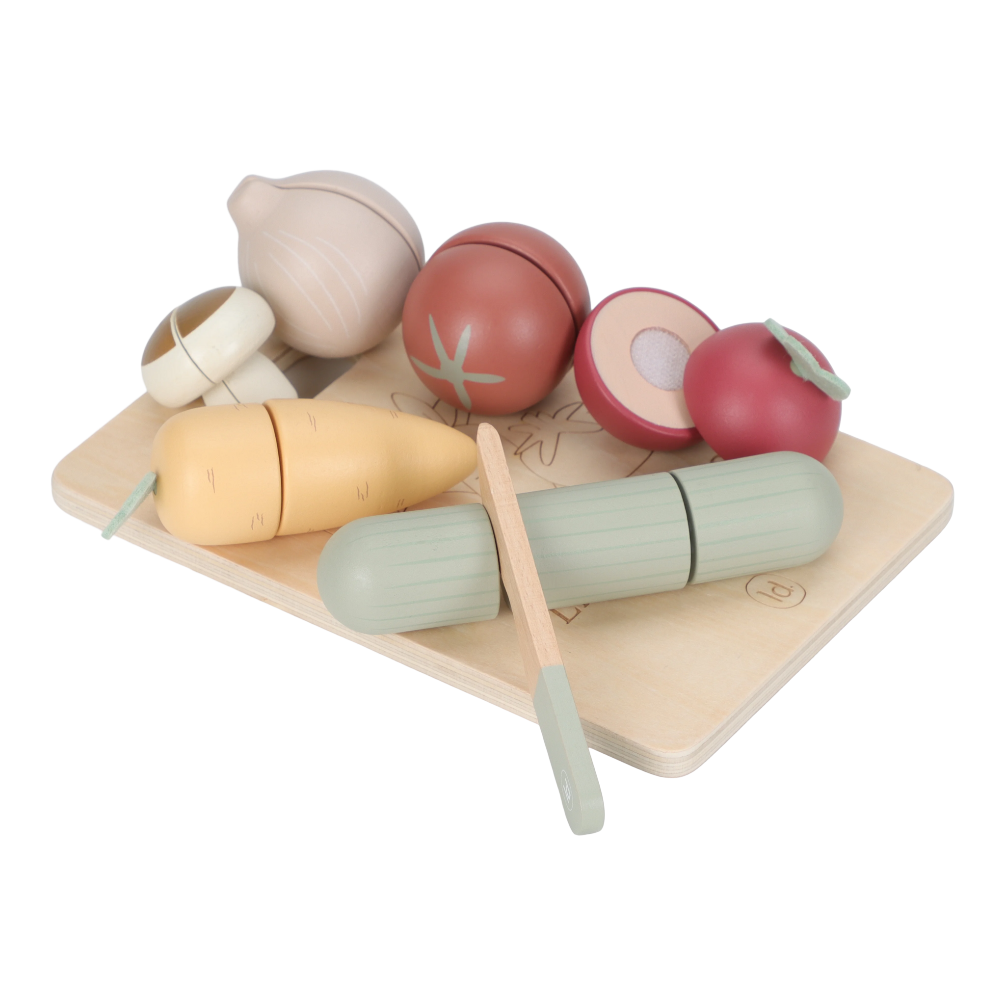 Time to prepare healthy vegetable dishes! This set of wooden cutting vegetables includes six different types: a carrot, cucumber, tomato, onion, beetroot, and mushroom. Cut them in half with the wooden knife and then easily stick them back together with the Velcro. Perfect for role-playing in the play kitchen and a fun way to learn more about healthy eating. What's on the menu today?