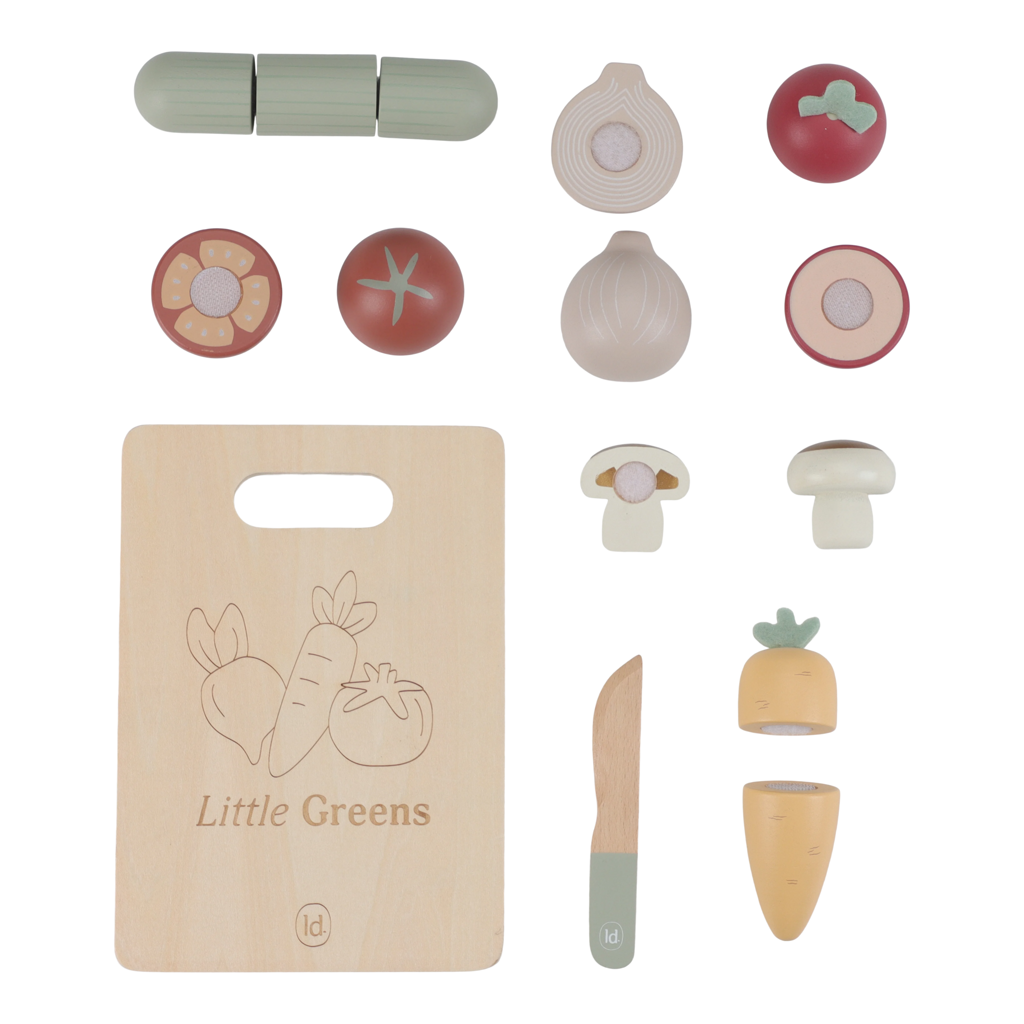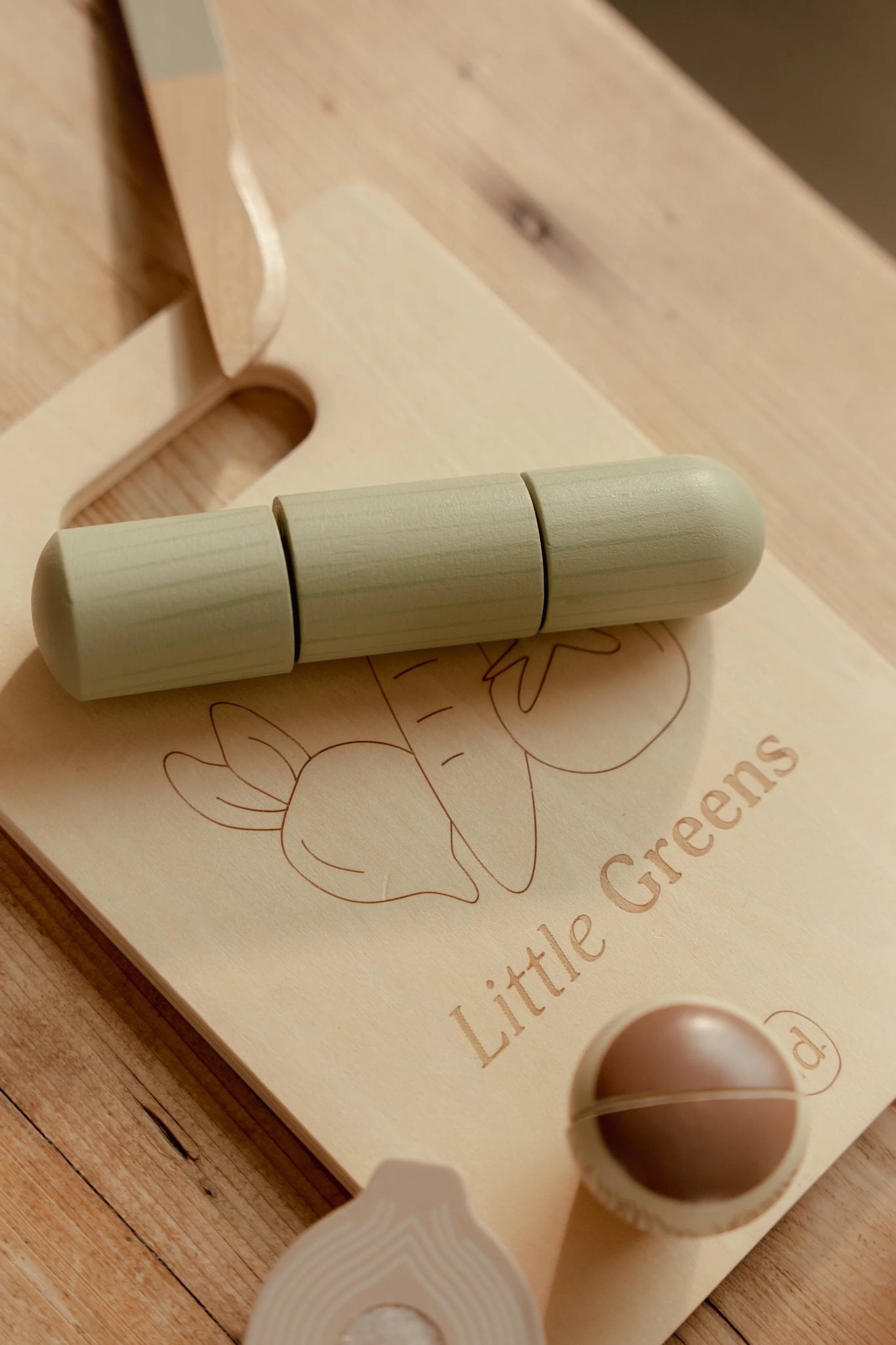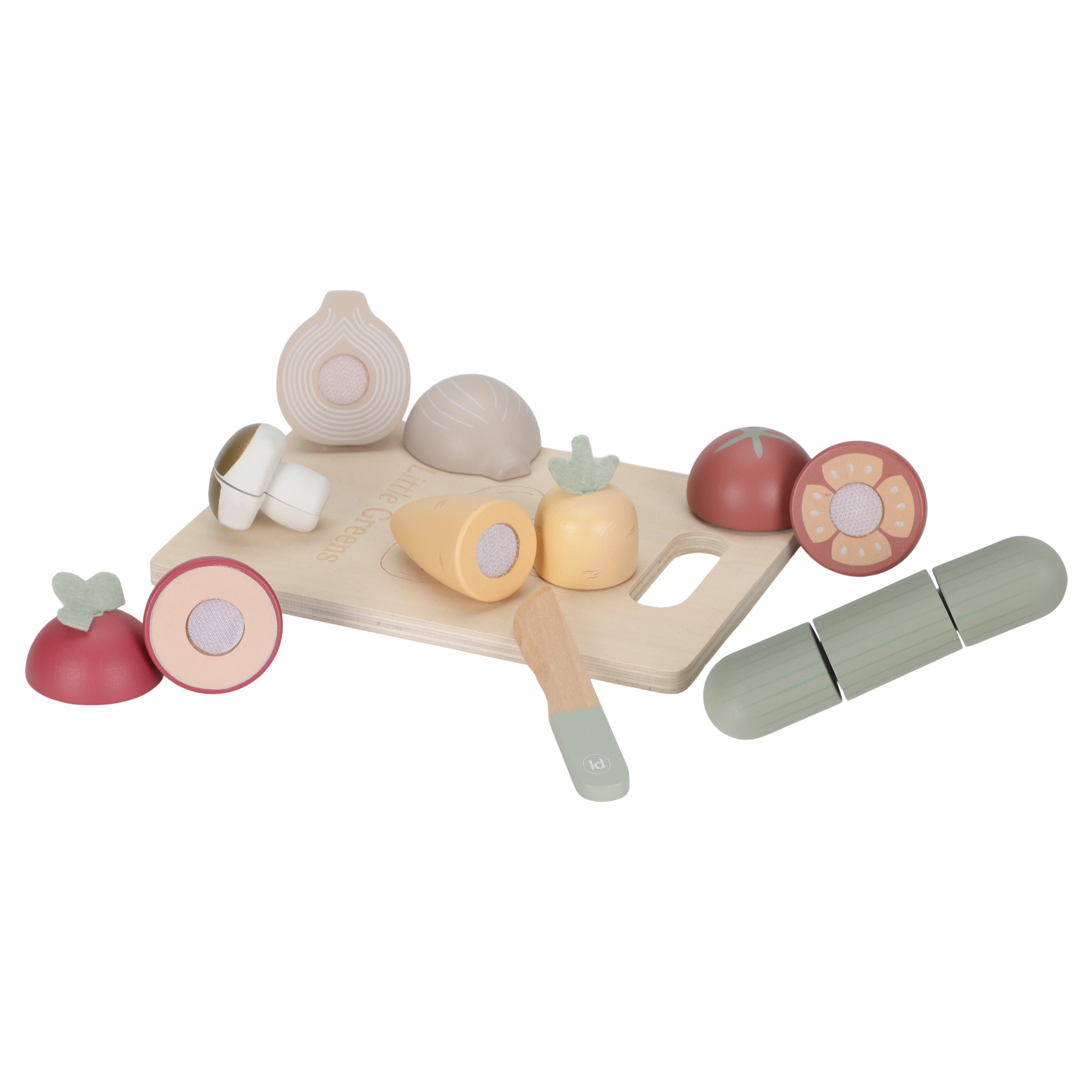 Time to prepare healthy vegetable dishes! This set of wooden cutting vegetables includes six different types: a carrot, cucumber, tomato, onion, beetroot, and mushroom. Cut them in half with the wooden knife and then easily stick them back together with the Velcro. Perfect for role-playing in the play kitchen and a fun way to learn more about healthy eating. What's on the menu today?