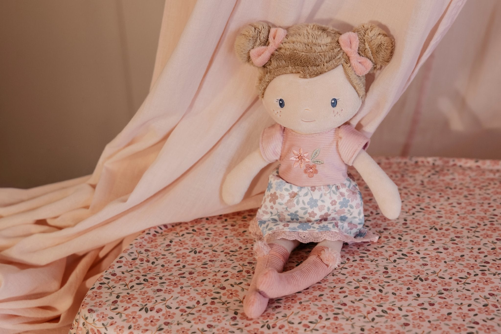 Meet lovely Rosa. This plush cuddle doll in her cute dress can't wait to be cuddled. Rosa can sit up and likes to go with you wherever you go. She will always be there when you want to play or need a big hug. What will be your first activity together? Maybe a walk through the garden with the matching wooden doll stroller? Rosa is soft and cuddly, she is 35 cm tall.